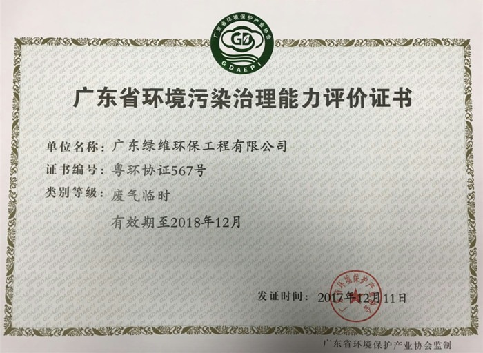 恭喜廣東綠維環(huán)保公司榮獲廣東省環(huán)境污染治理能力評價證書